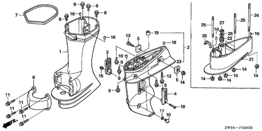 Модификация Вашего двигателя: Honda BF10D4 SHK Вернуться к выбору узлов мотора Картер коробки передач / Удлинение корпуса |