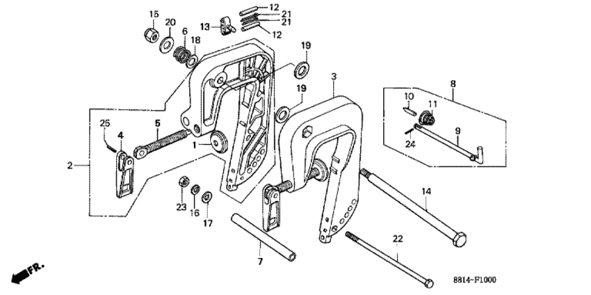 Модификация Вашего двигателя: Honda BF100F SC Вернуться к выбору узлов мотора Кронштейн транца / Регулировочная тяга |