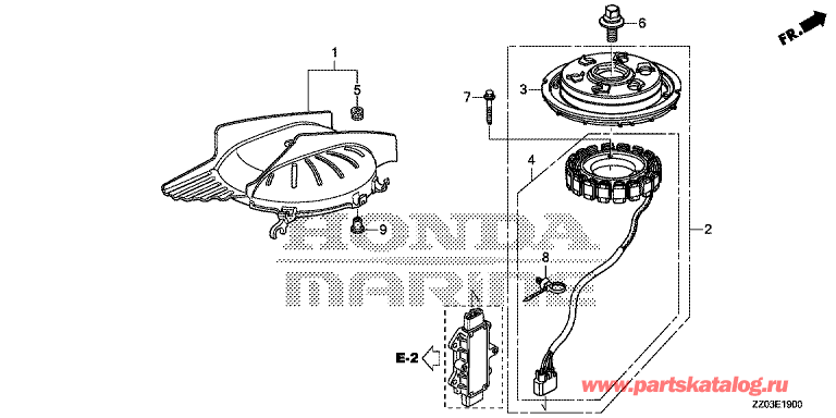 Модификация Вашего двигателя: Honda BF100AK1 LRTU Вернуться к выбору узлов мотора E-19 Генератор переменного тока |